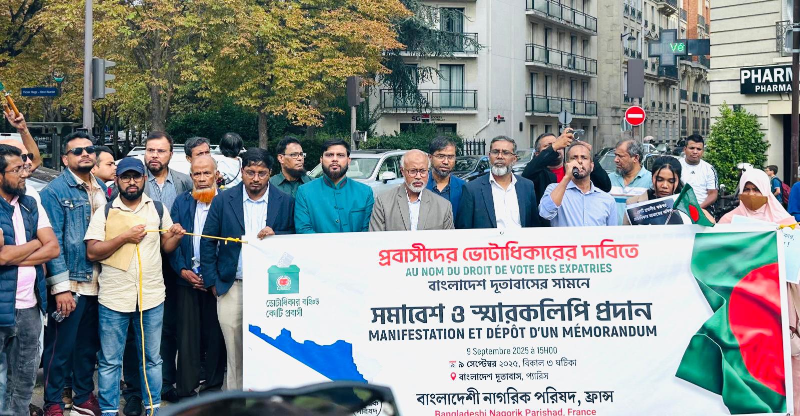প্রবাসীদের ভোটাধিকারের দাবিতে প্যারিসে বাংলাদেশ দুতাবাসের সামনে অনুষ্ঠিত সমাবেশ বক্তরা বলেছেন, অতীতের কোনো সরকারই প্রবাসীদের ভোটাধিকারের দাবি পূরণে সত্যিকার অর্থে কেনো আন্তরিকতা দেখায়নি।বিগত ৫৪ বছর শুধু প্রতিশ্রুতির মুলা ঝুলিয়ে রাখা হয়েছিল।অথচ প্রবাসী বাংলাদেশীরা রেমিট্যান্স পাঠিয়ে দেশের অর্থনীতির চাকা সচল রেখে আসছে নিরলসভাবে।
